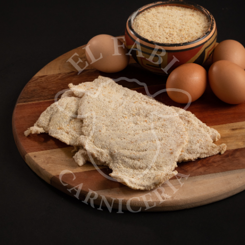 Filet de pechuga fileteado pasado una sola vez por huevo y pan rallado.